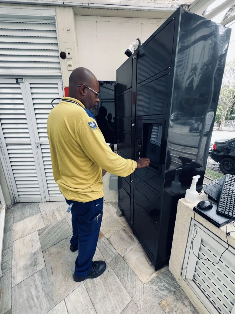 Simples! Cada morador recebe uma senha fixa durante o cadastro. Ao clicar em “Retirar” no armário e inserir a senha, todas as portas com encomendas destinadas a ele se abrem simultaneamente. Assim, os armários funcionam de forma independente 24/7.
